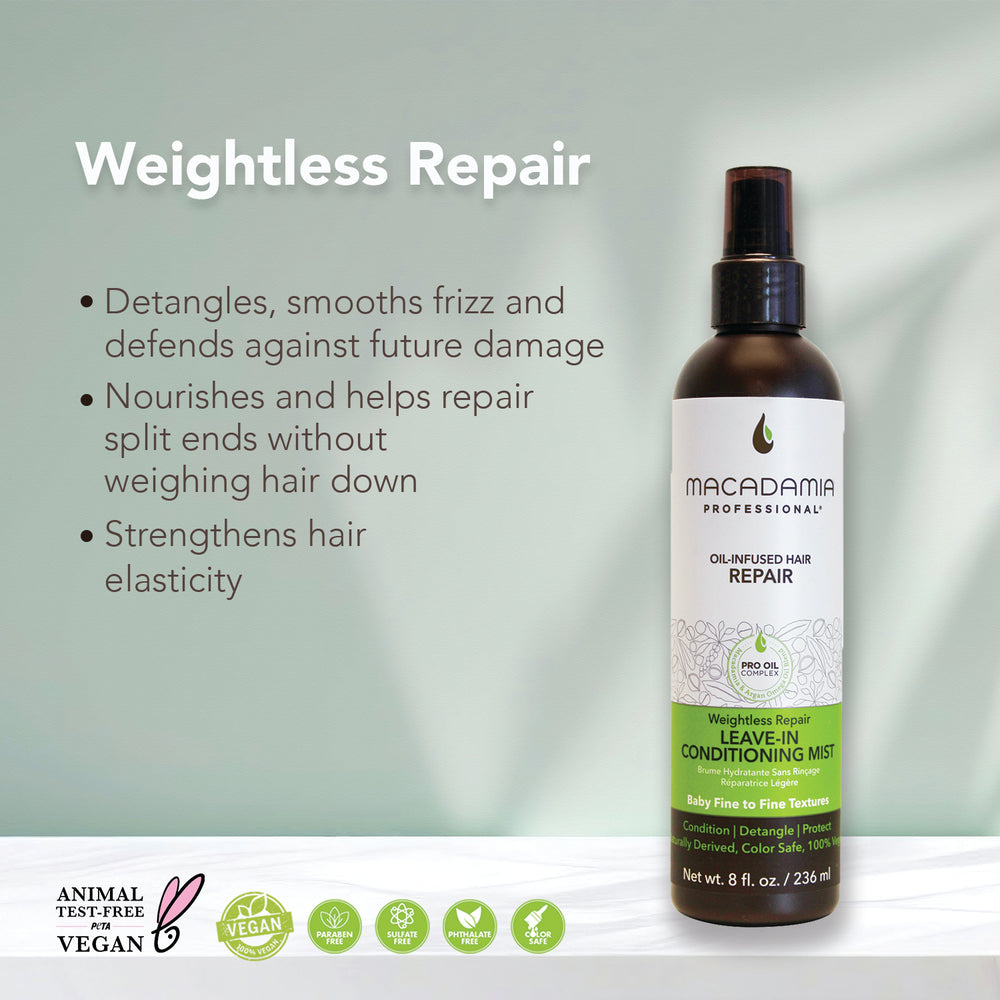 This nutrient-rich leave-in hydrating mist detangles, smooths frizz and defends against future damage. Nourishes and helps repair split ends without weighing